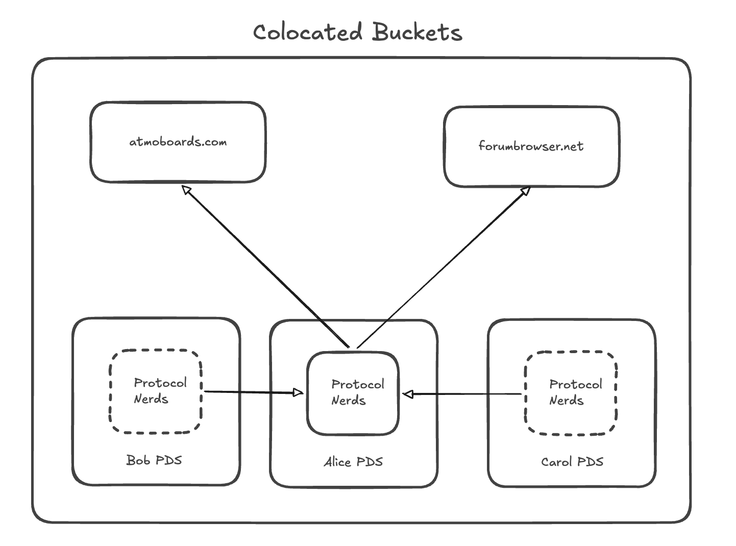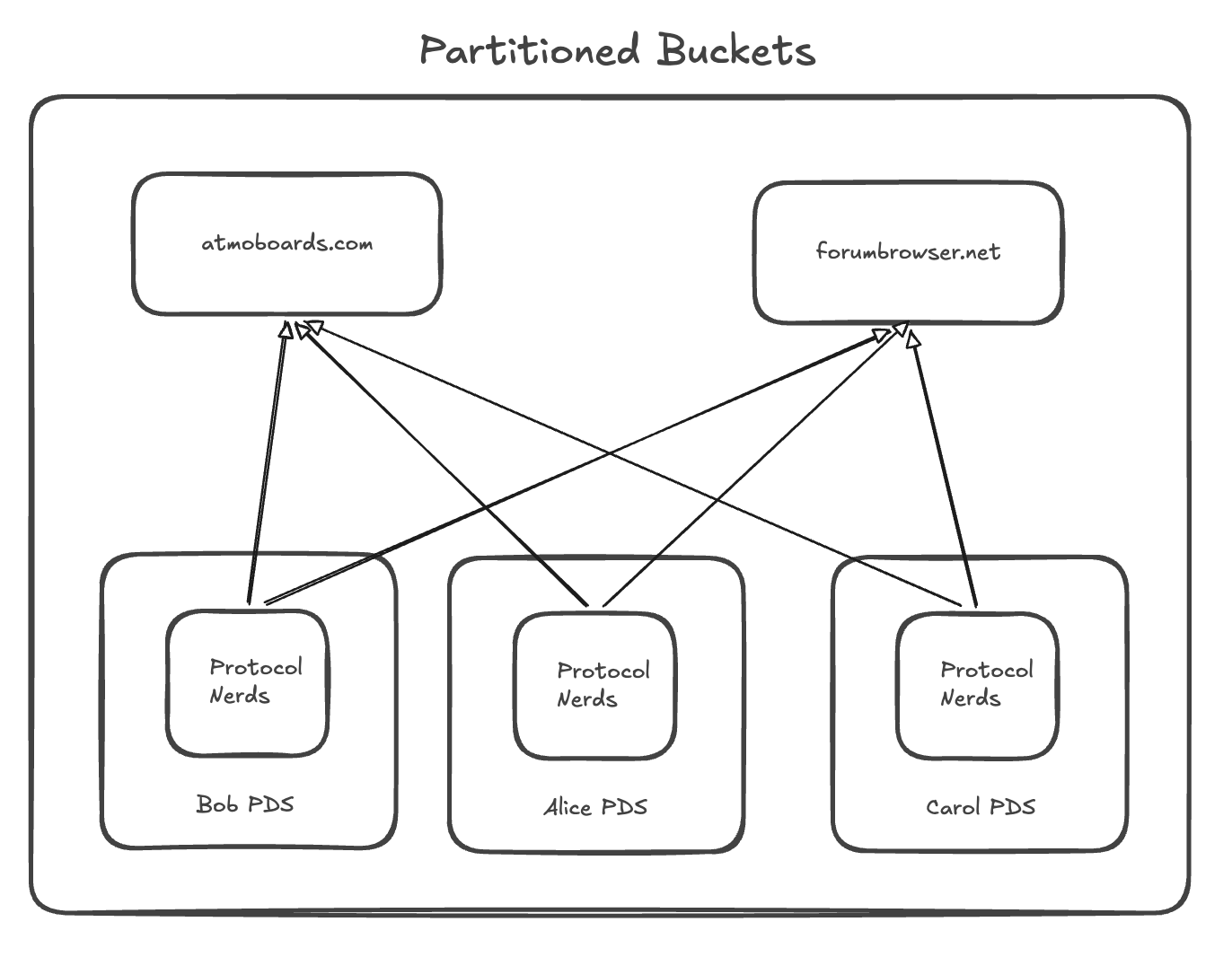 Partitioned buckets are that same model, with access control layered on top. An app that wants to sync the Protocol Nerds forum goes and talks to Alice’s PDS, Bob’s PDS, Carol’s PDS, and all the others and stitches together the view. This is more work for the app. But it also mirrors how atproto works for public data.